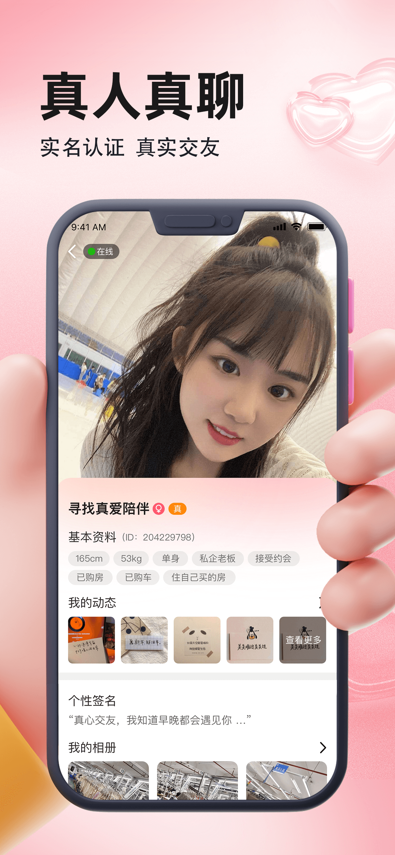 每一位新用户都需要经过系统、人工双重审核,有超过9成的用户已通过真人认证,致力于打造更真实的脱单平台。