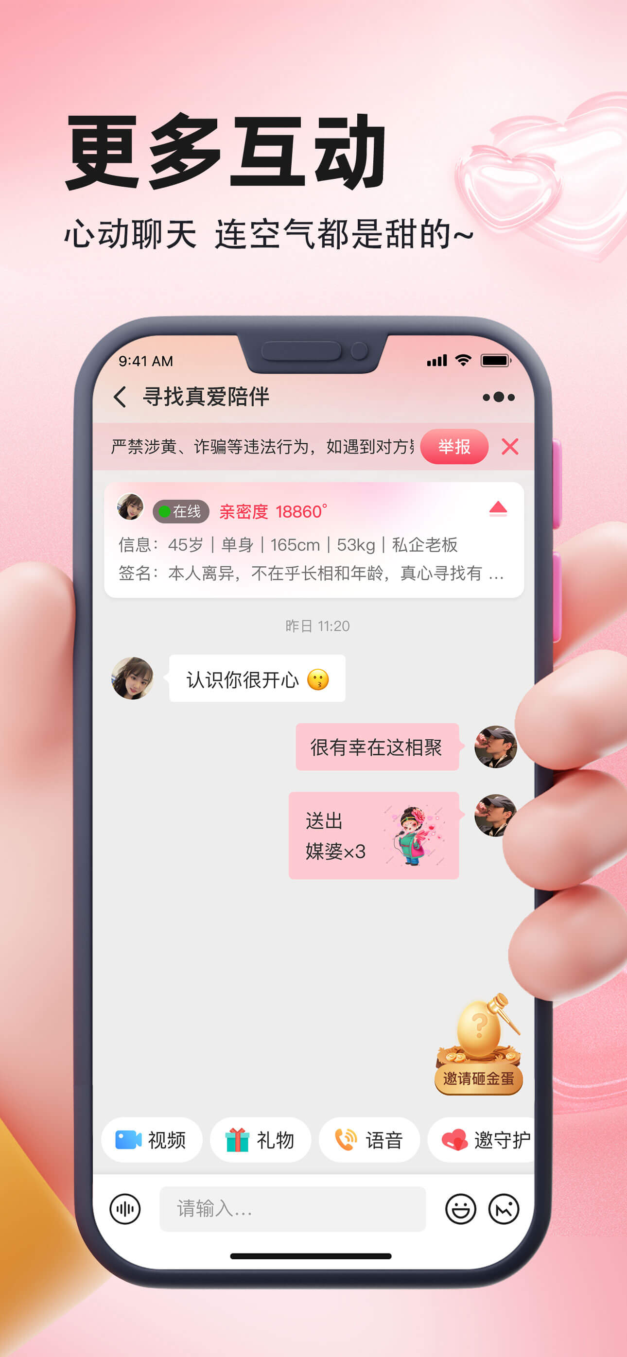 支持在线文字,语音,视频聊天互动,在线视频近距离面对面聊天,感情快速升温.